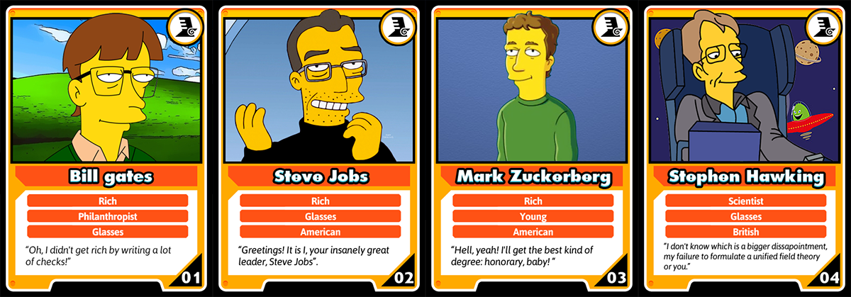 Suppose that player A adds as a suspect Bill Gates. This now means that Player A has the attributes “Rich”, “Philanthropist” and “Glasses”. Therefore, when the Player B asks for Steve Jobs, although the properties of “Glasses” and “Rich” are on the list, “American” isn’t, so we can be sure that Steve Jobs is not a suspect.