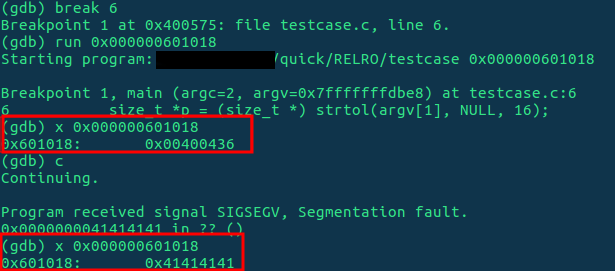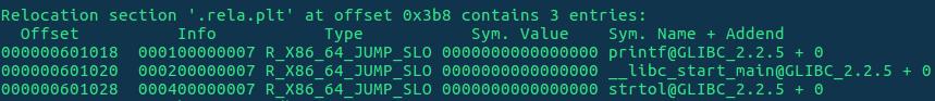 Vamos a hacer un puntero a cierta dirección pasada por parámetro (algo dentro de la GOT), y a escribir 0x41414141, en ella. Para saber dónde está la GOT podemos hacer un readelf -r para ver las relocations del programa: