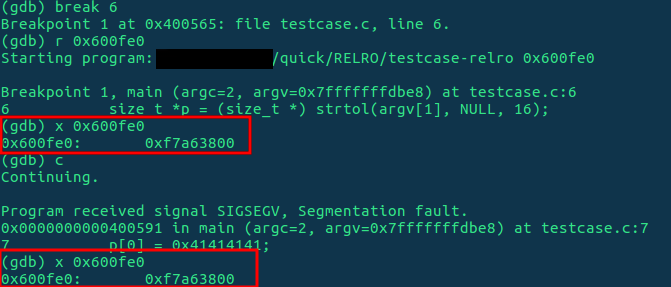 En el primer rectángulo examinamos los contenidos de 0x0601018 antes de escribir, y en el segundo podemos ver que hemos conseguido escribir en la GOT. Vamos a comparar qué pasa cuando compilamos con gcc -Wl,-z,relro,-z,now. Primero localizamos dónde está printf, en 0x600fe0.